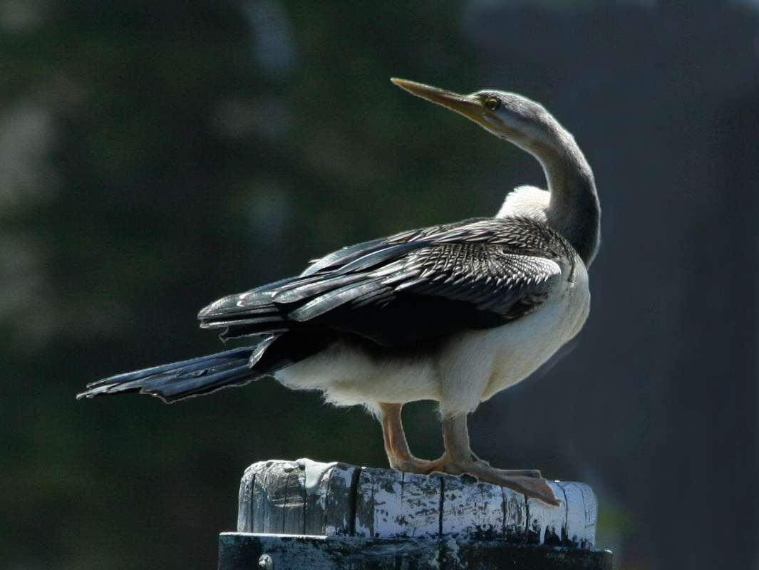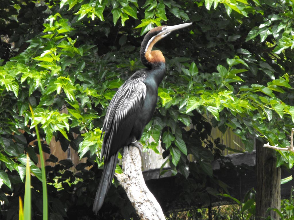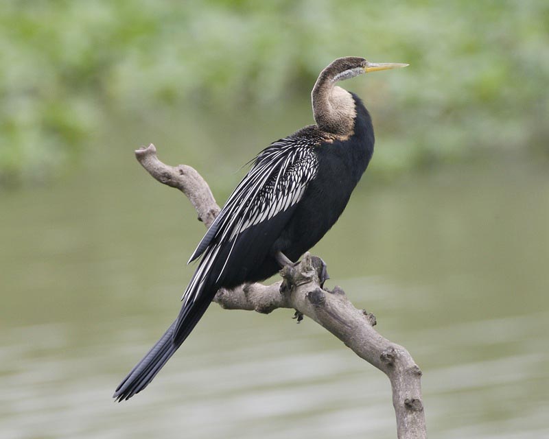 Anhingidae typically inhabit fresh water lakes, rivers, marshes, swamps, and are less often found near salt water. They favor tropical environments. Anhingas have a more pointed bill than cormorants which allows them to spear fish. They have completely webbed feet, and their legs are short and set far back on the body. The males have black and dark brown plumage, a short erectile crest on the nape and a larger bill than the female. The females have a much paler plumage, and are a bit larger overall.