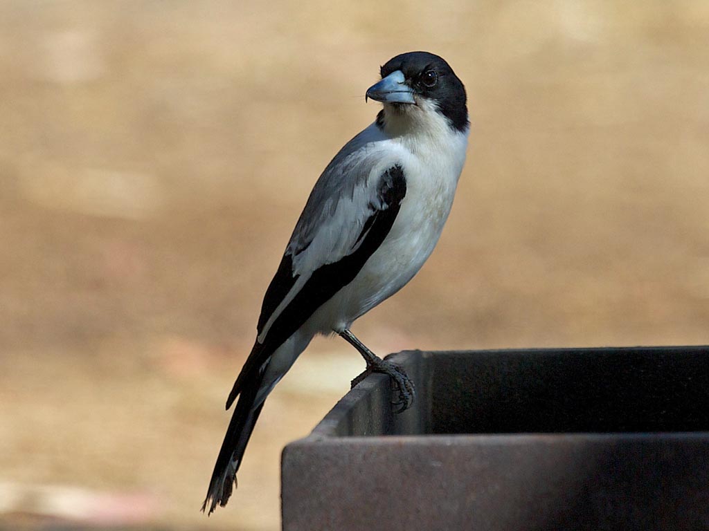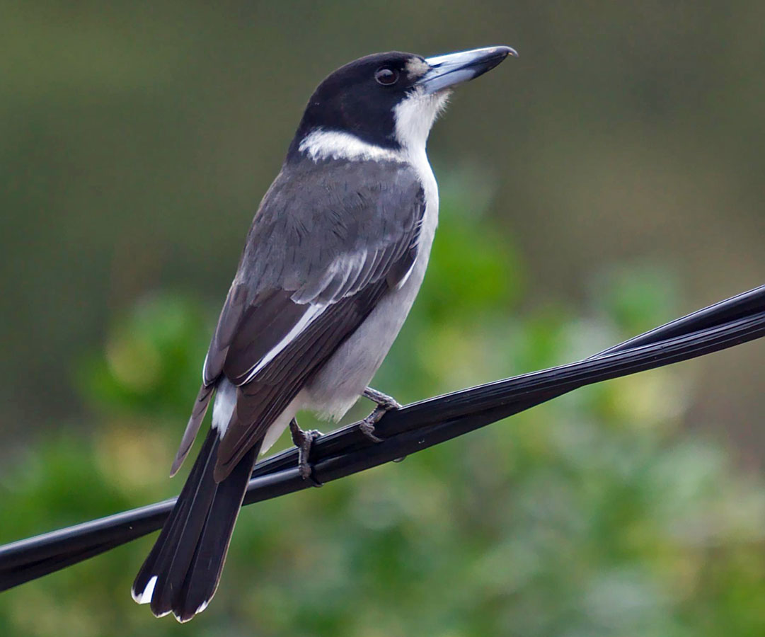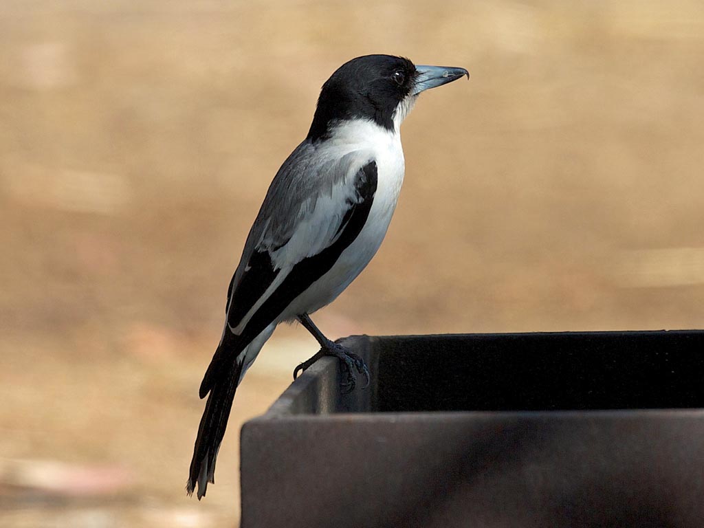 The Hooded Butcherbird has black head, nape, throat; white underparts, rump, back; black-and-white mantle; black tail with broad white tip; bluish-gray bill with black tip.