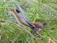Mimidae, will mimic noises during mating season (hence the name "liar"). Male lyrebirds have beautiful tails when they are fanned out.