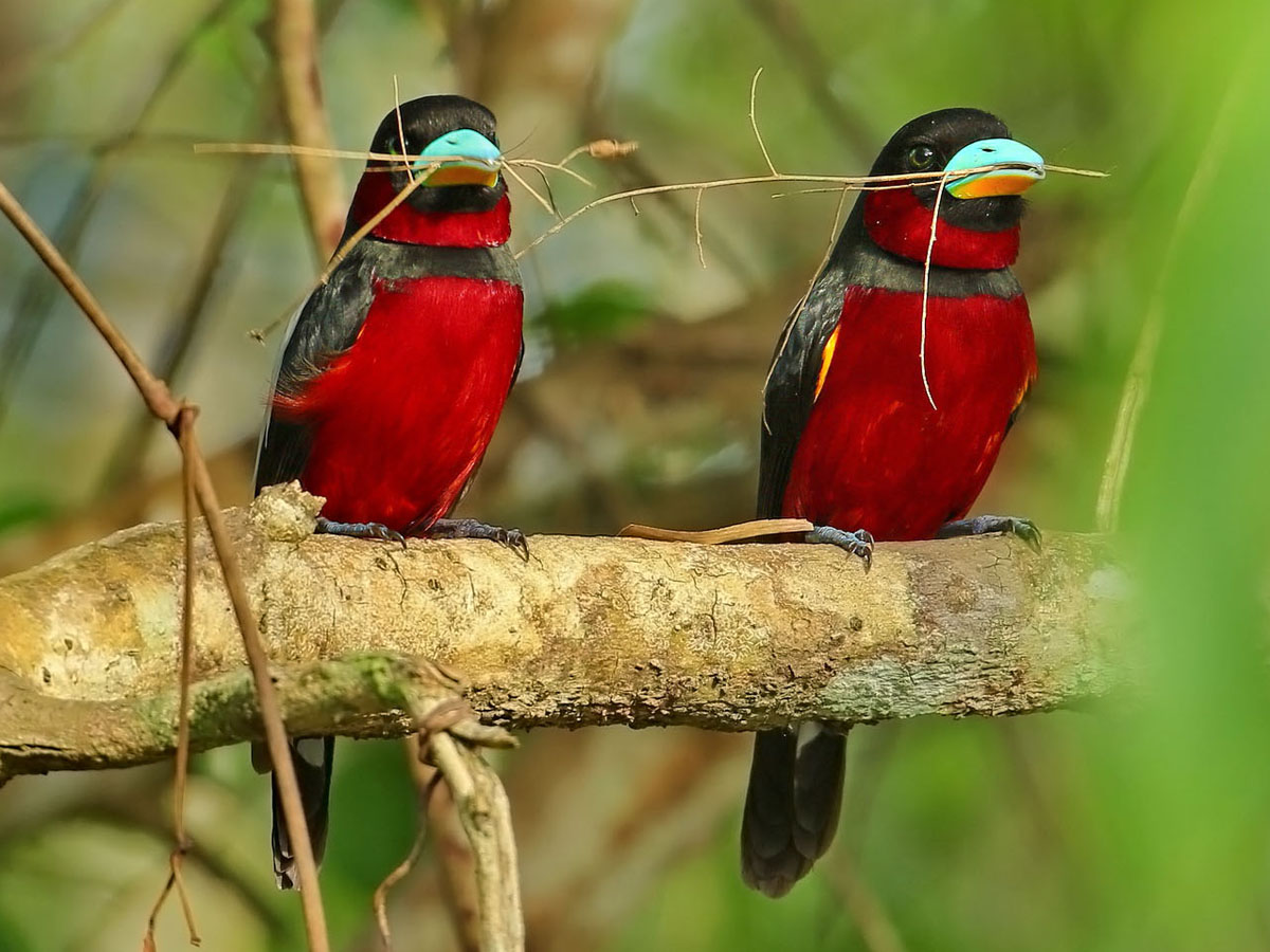 Many of the broadbills are brightly colored birds that present broad heads, large eyes and a hooked, flat and broad beak. They range from 13 to 28 centimetres in length, and live in the dense canopies of wet forests, allowing them to hide despite their brightly coloured