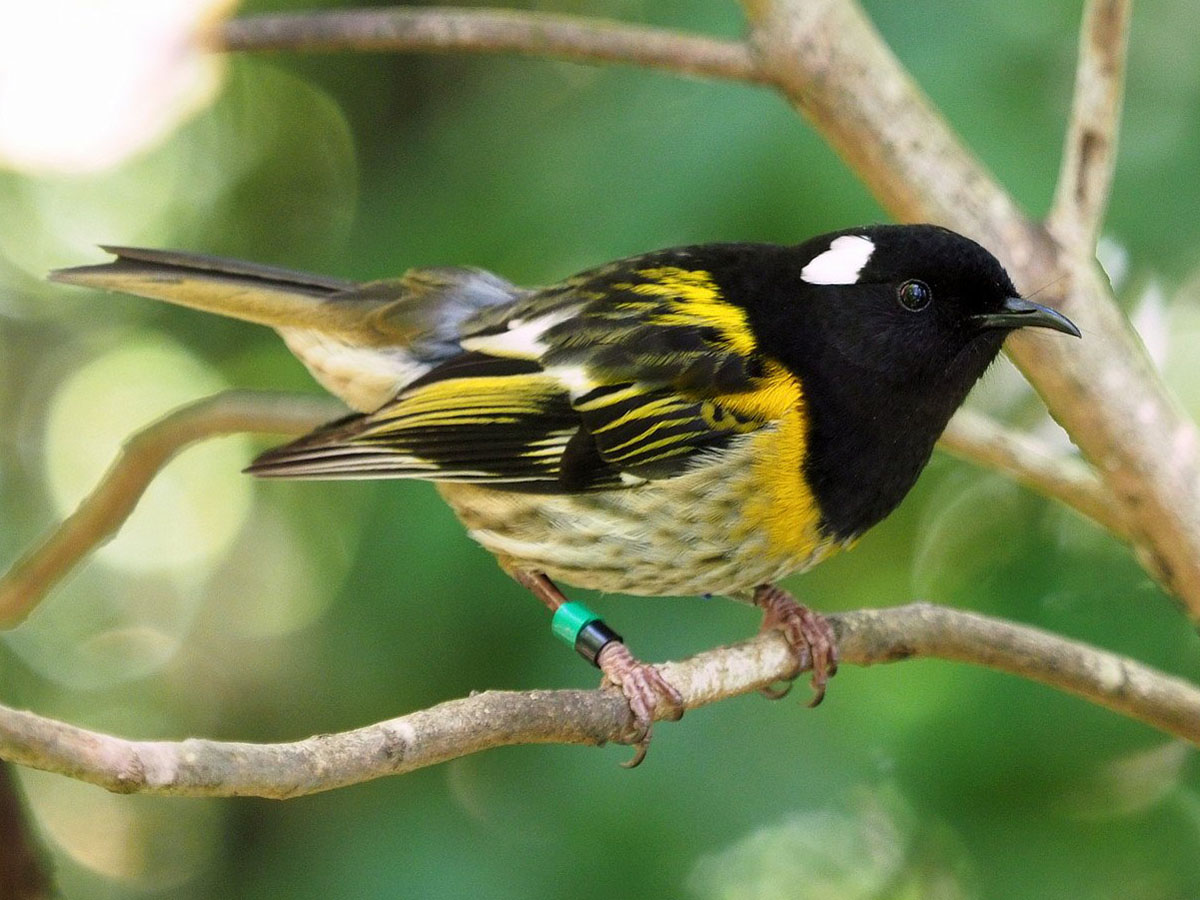 Stitchbird. The Stitchbird or hihi is a rare honeyeater-like bird endemic to the North Island and adjacent offshore islands of New Zealand. It became extirpated everywhere except Little Barrier Island but has been reintroduced to three other island sanctuaries and two locations on the North Island mainland. Its evolutionary relationships have long puzzled ornithologists, but it is now classed as the only member of its own family, the Notiomystidae.
