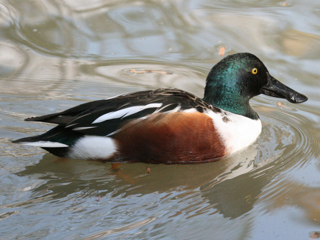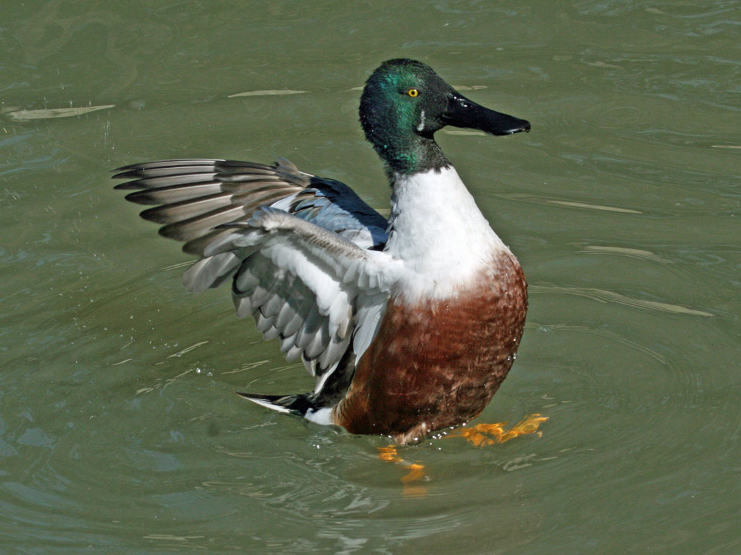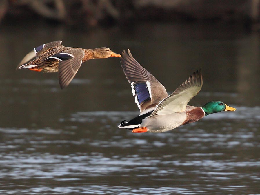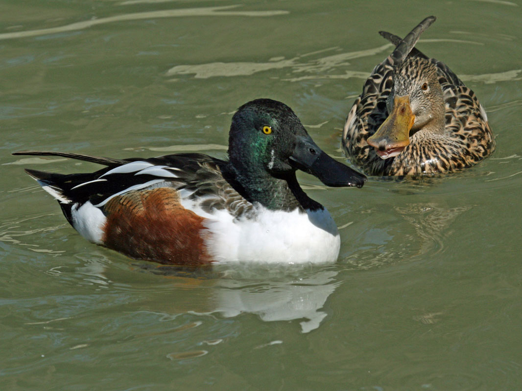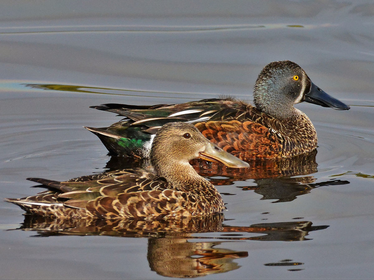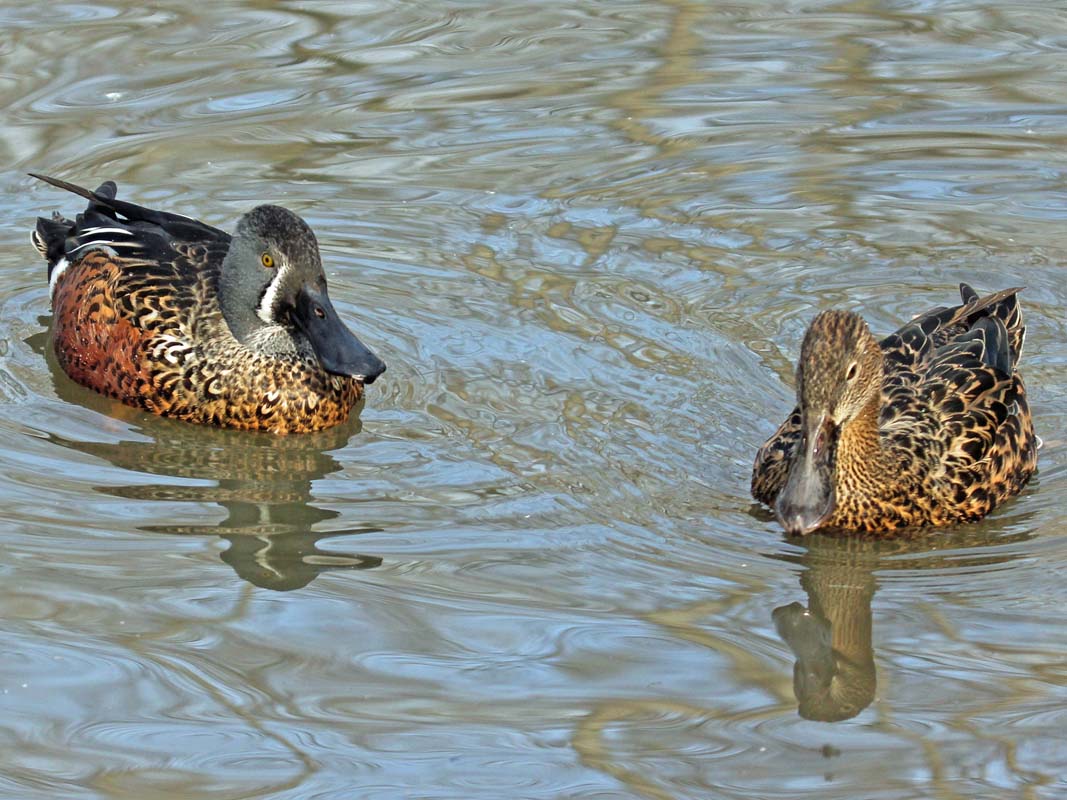 Most species of the order Anseriformes spend a considerable amount of time in water. In fact, they are called waterfowls. Their webbed feet make for efficient swimming. A few species spend little time in water and thus their feet are only partially webbed. Most waterfowl are also good flyers, many migrating long distances to escape the cold and others migrating shorter distances for optimizing their food supply. All species, except the screamers, have a wide and relatively flat bill. The shape of a species bill and also their tongue is a function of their diet. Considering the entire order, they eat aquatic plants, grasses, sedges, algae, plankton, insects, insect larvae, mollusks, crustaceans, fish, fruits, grains, rice. Most species are monogamous and if they lose a partner seem to mourn. Males are larger and heavier than females. The chicks are well developed when they hatch and can walk almost immediately.