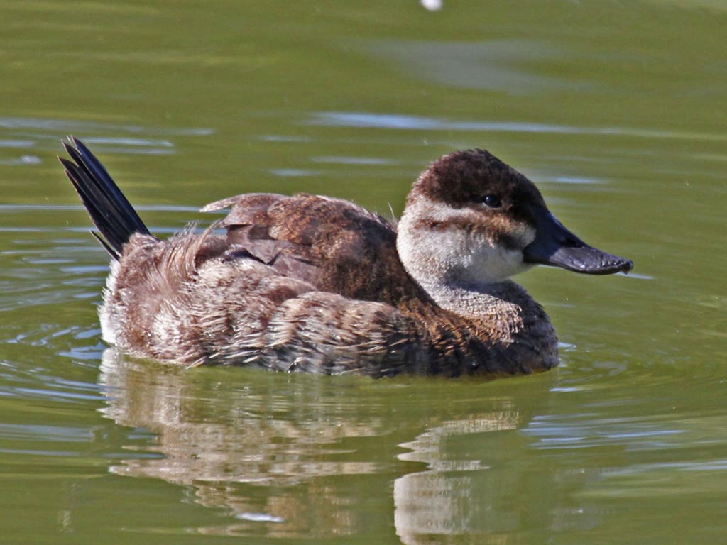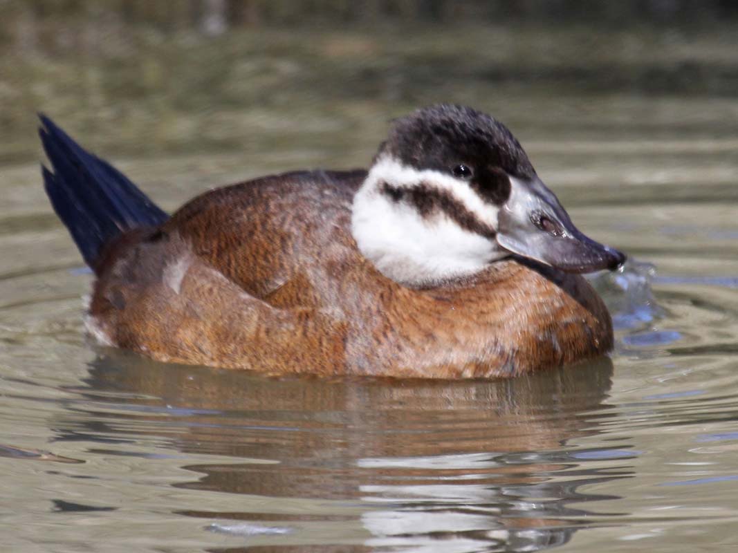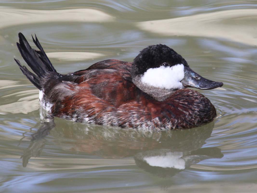 Oxyura stiff-tail ducks have a stiff tail which is often erect at rest and open in the shape of a fan; large swollen bill; legs set far back so they walk awkwardly and rarely leave the water.