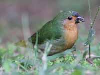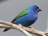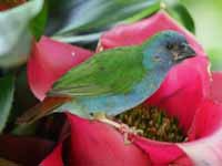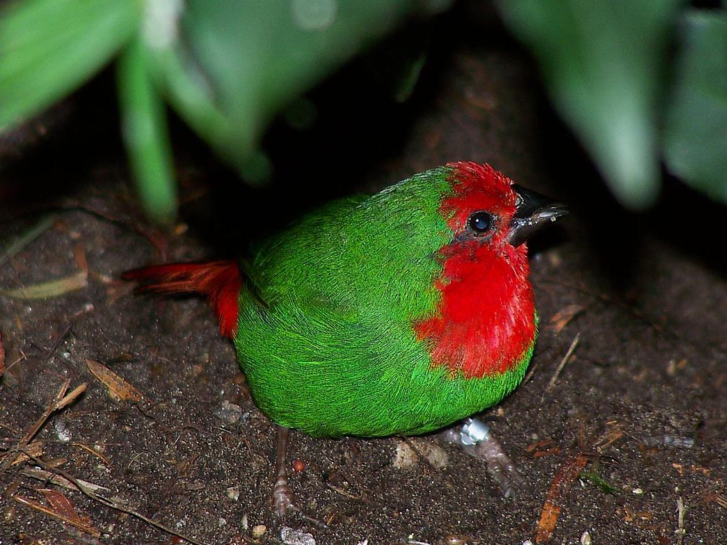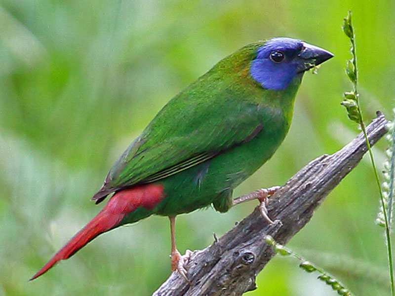 parrotfinch are found in Southeast Asia, Australasia, and many Pacific islands. They are 9 to 15 cm long, are predominantly green and usually colorful with blue or red faces and red rumps. Most are seed eaters and will also eat some small insects. An exception is the red-headed parrotfinch which favors fruits such as figs. They are social, usually feeding in flocks. The parrotfinches of the Pacific islands such as the red-headed parrotfinch on Samoan islands, red-throated parrotfinch on New Caldonia, and the royal parrotfinch on Vanuatu are have small isolated populations which has evolved to have subtle differences. Since they are rarely photographed and poorly described, location is the best identifying feature.