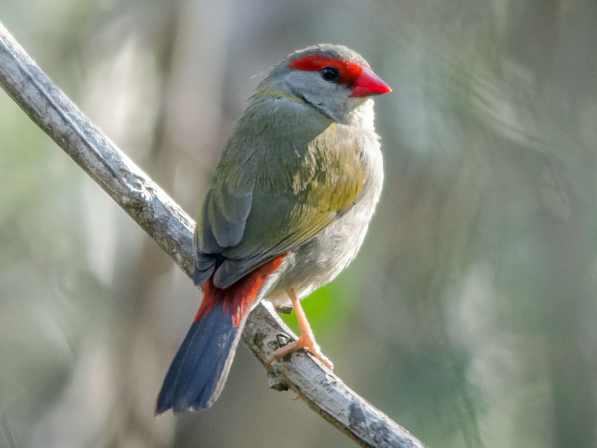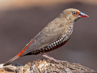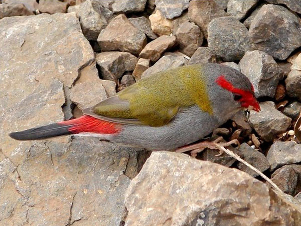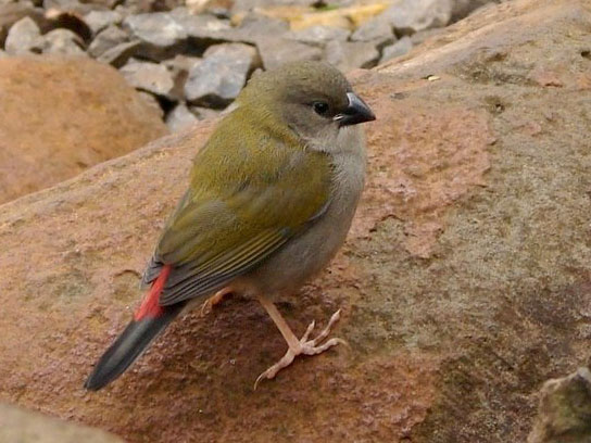 These three firetail species are found in Australia. They have brown upperparts, a red rump, and also a red bill.