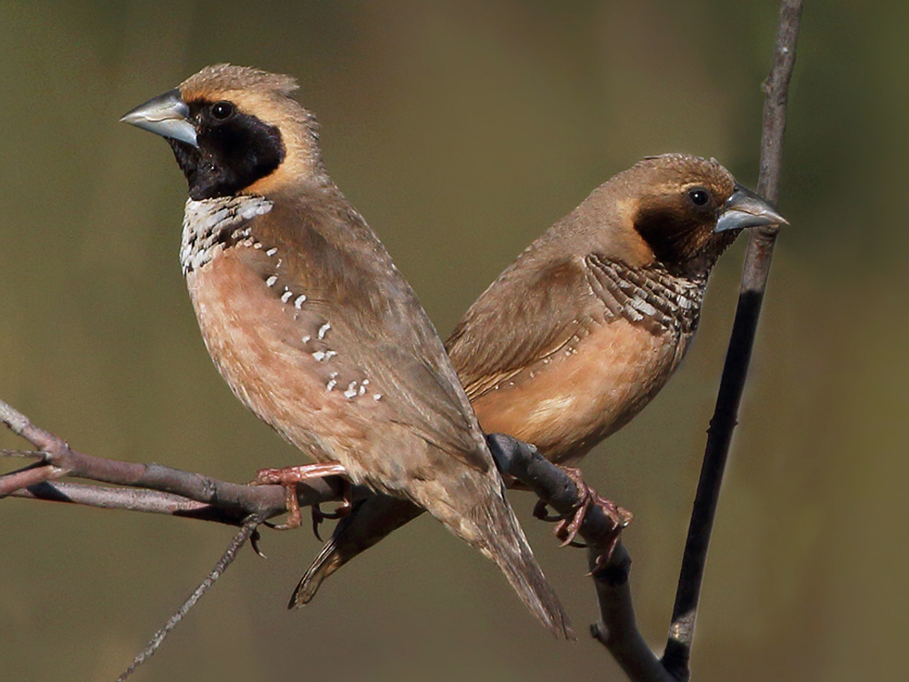 Both species have white-cheeked black heads and thick bills.