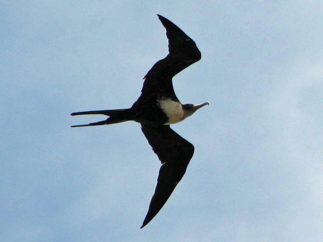 Frigatebirds are large, with iridescent black feathers (the females have a white underbelly), with long wings and deeply-forked tails. Frigatebirds are found over tropical oceans and ride warm updrafts. Having the largest wingspan to body weight ratio of any bird, they are essentially aerial, able to stay aloft for more than a week, landing only to roost or breed on trees or cliffs. Because of their great flying ability, the legs have evolved to be small. These birds do not swim, cannot walk well, and cannot take off from a flat surface. Fish are caught in the air, or close to the surface via the birds long bill.