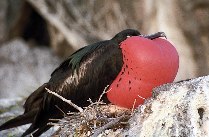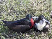 Female frigatebirds are slightly larger than males. The males have inflatable red-colored throat pouches which they inflate to attract females during the mating season. Nests are made of sticks and other material. The nest is place in trees if available; cliffs and bushes are also utilized. They are place on the ground as a last resort since the eggs and chicks are vulnerable to predators there. Incubation and feeding of chicks is shared by the parents. The fledged chicks take months before they are able to obtain all the food they need. In the meanwhile, the eat regurgitated food brought by the adults.