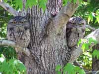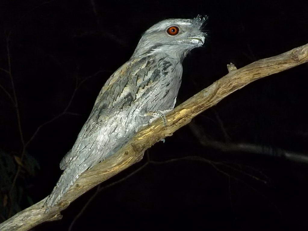 With their big head and large eyes for night vision, frogmouths also resemble owls in appearance. Like them the frogmouth is relatively silent in flight and has 3 toes facing forward plus one towards the read. Unlike owls, the frogmouth can rotate its eyes so the range of motion of its head is much less than the owl’s. And a frogmouth’s feet are much shorted and weaker that an owl’s that uses the raptor-like claws to catch prey.