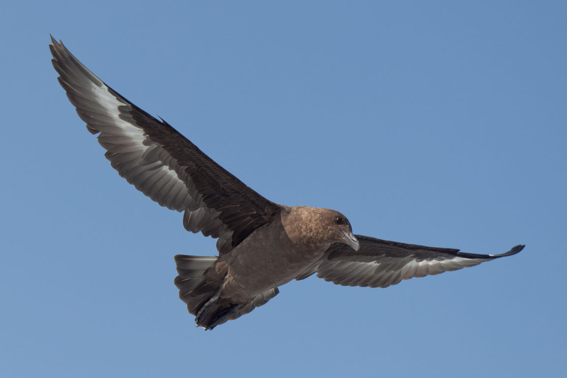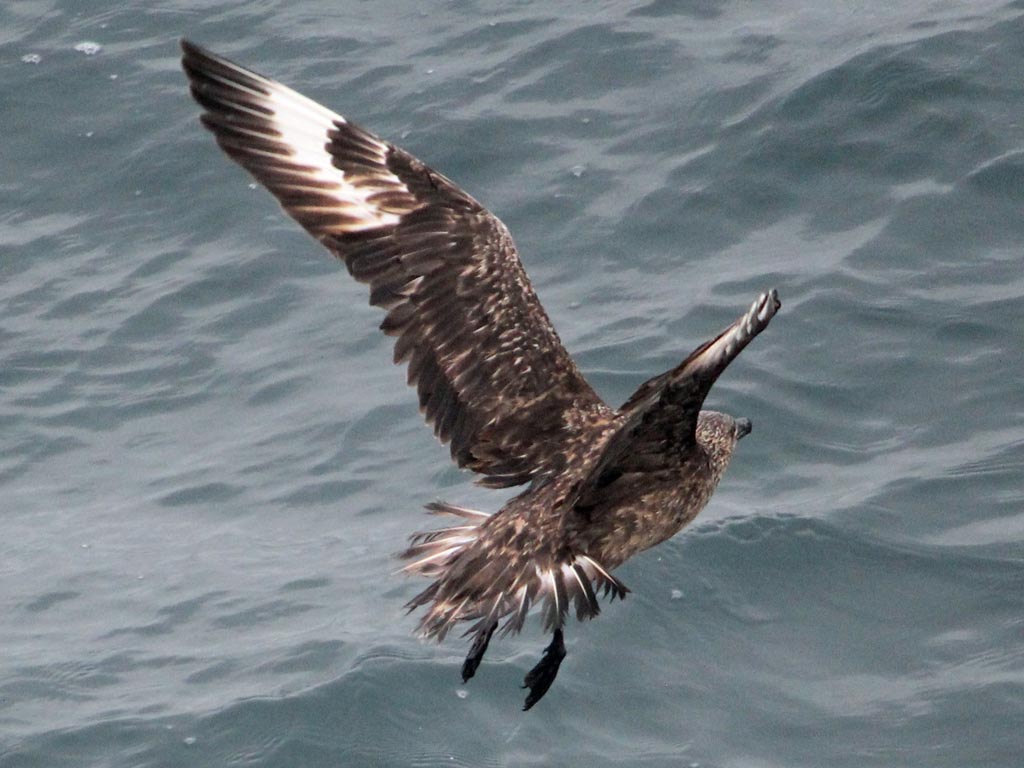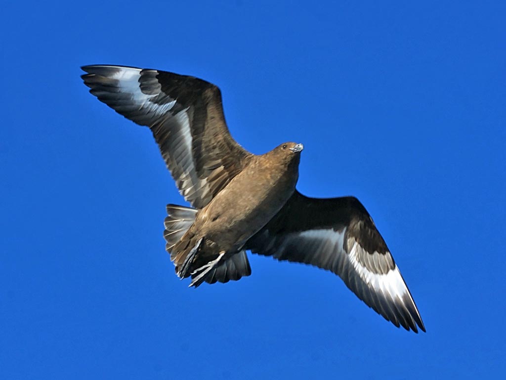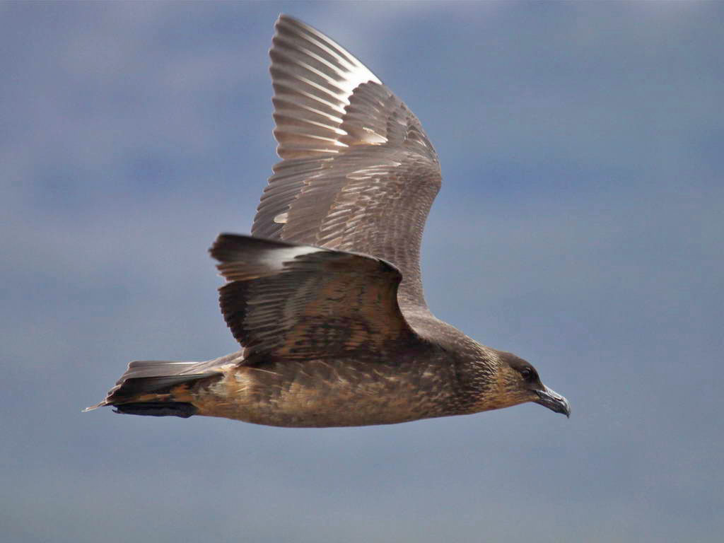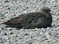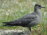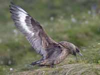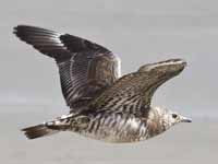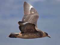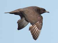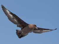 Skuas are in general medium to large birds, typically with gray or brown plumage, often with white markings on the wing. On average, a skua is about 56 cm and 121 cm across the wings. They have longish bills with a hooked tip, and webbed feet with sharp claws. They look like large dark gulls. The skuas are strong, acrobatic fliers. They are generally aggressive in disposition. Potential predators who go near their nest will be quickly dived at by a parent skuas. They will chase gulls, terns and other seabirds to steal their catches, regardless of the size of the species attacked (up to 3 times heavier than the attacking skua). The larger species also regularly kill and eat adult birds. On the breeding grounds they commonly eat the eggs and young of other birds. [abstracted from Wikipedia]