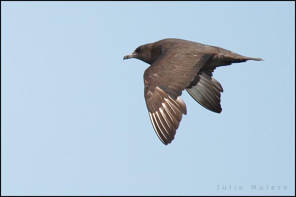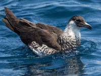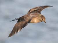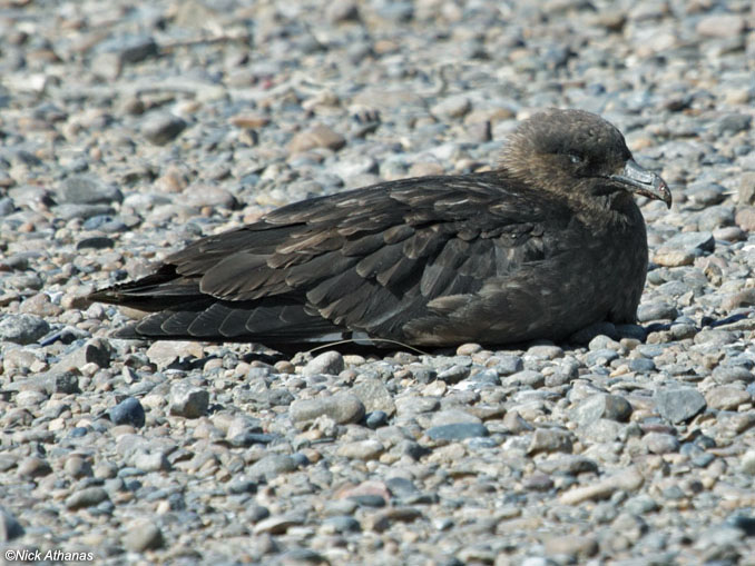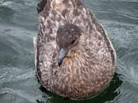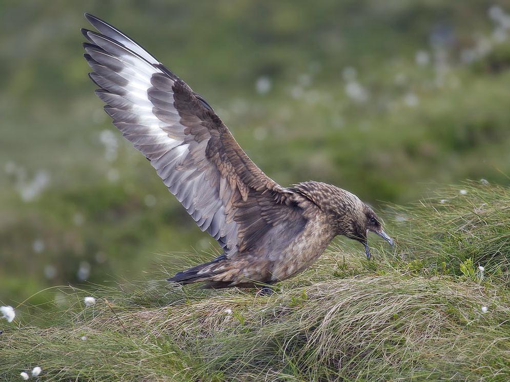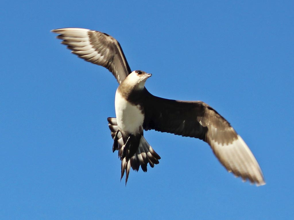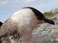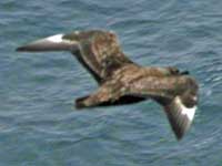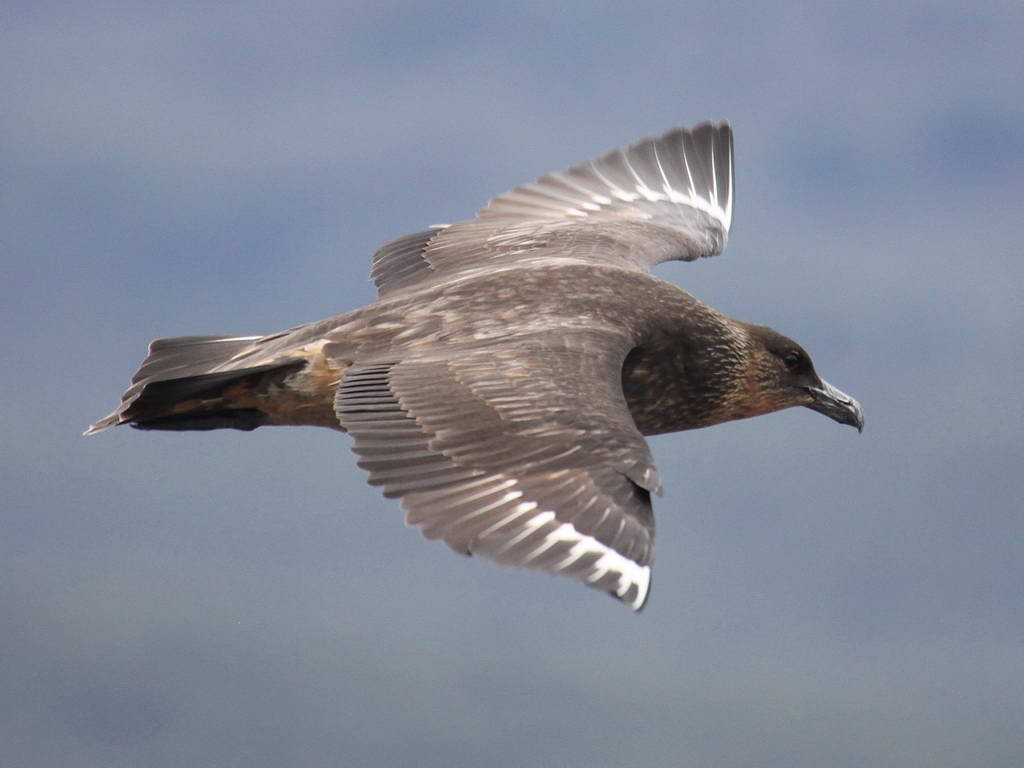 Skuas are in general medium to large birds, typically with gray or brown plumage, often with white markings on the wing. On average, a skua is about 56 cm and 121 cm across the wings. They have longish bills with a hooked tip, and webbed feet with sharp claws. They look like large dark gulls. The skuas are strong, acrobatic fliers. They are generally aggressive in disposition. Potential predators who go near their nest will be quickly dived at by a parent skuas. They will chase gulls, terns and other seabirds to steal their catches, regardless of the size of the species attacked (up to 3 times heavier than the attacking skua). The larger species also regularly kill and eat adult birds. On the breeding grounds they commonly eat the eggs and young of other birds. [abstracted from Wikipedia]
