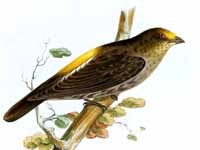 Most honeyguides are dull-colored, though some have bright yellow coloring in the plumage. All have light outer tail feathers, which are white in all the African species. Honeyguides are among the few birds that can digest wax. They vary from 10 to 20 cm in length and 10 to 55 grams in weight. The nesting behavior is not known for all the species, but the existing knowledge indicates that all lay their eggs in the next of other species, that is they are brood parasitic. Only one egg is put in each hosts next, and the deposits are often spread over varous species. Least you think this behavior is benevolent, both the parents and the baby honeyguides usually kill the other offspring that are in the nest.