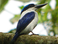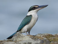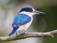Todiramphus are medium-sized kingfishers with flattened beaks. They are typically blue or blue-green above with pale underparts. They often have a pale collar and stripe over the eye. Most are found in Australasia. Many species are restricted to relatively small islands such as Guam and lesser known islands in French Polynesia. The conservation status of these more isolated species often indicates a threat to their population because of a small range and also due to deforestation. For these small isolated populations it can be difficult to observe and photograph them.