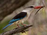 Many species are commonly found well away from water and feed largely on terrestrial animals such as insects and lizards. Ones that are found near water mainly eat crustaceans, snails, and small fish. As is true for all kingfishers, the nest is built in a cavity. Most often this is in a termite mound that is located in a tree. Sometimes termite mounds on the ground are used and sometimes tunnels are excavated in bankings. Tree cavities are also used.
