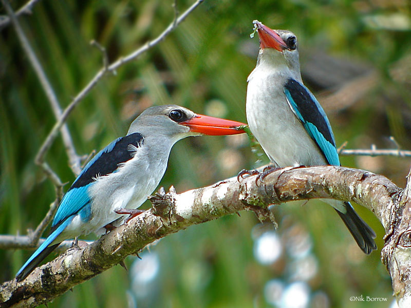 The nests are located most often in a cavity located in a tree. This could be a natural tree cavity, or one created by an unrealted bird such as a woodpecker, but most often it is a burrow that the kingfisher created in termite mound. Not only is a termite nest easy to tunnel into to create a kingfisher nest, the termite nest is fertile which attract grasshoppers and other insect. No nest material is added, although litter may build up over the years. Some species create their nest in terrestrial termite mounds and othes tunnel into earth bankings. Both parents incubate the eggs and feed the chicks. Egg laying is staggered at one-day intervals so that if food is short, only the older, larger nestlings get fed.