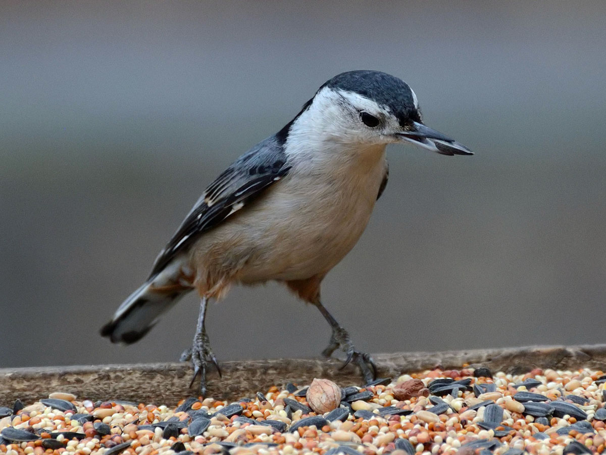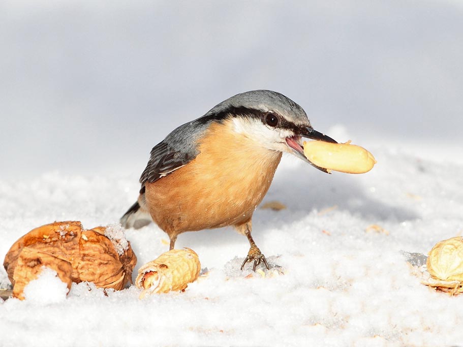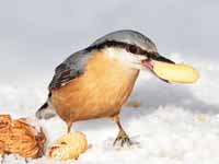 eat seeds at least during the winter, when invertebrates are less readily available. The nuthatches all store food, usually seeds, which may be pushed into crevices or into the ground, hidden under small