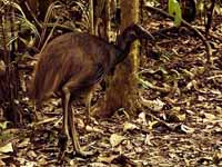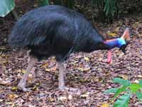 Another attention getting attribute of the cassowary is its size. they are the forth heaviest bird species, coming after the 2 ostrich species and emu in weight. The female southern cassowary can reach 2 meters in height and almost 60 kg; males are a little smaller. But the ostrich can attain 150 kg, and 2.8 meters in height. That said, the cassowary is said to be the most dangerous bird in the world! At the end of their long and study legs they have big feet. The three toes all face ford and the middle toe has a pointed daggar-like claw. Driving that claw into an enemy's stomach or neck could be fatal. The long legs allow a casswary to run fast, up to 50 km per hour. The fastest bird on land is the ostrich at 70 km per hour which is close to the speed of the fastest horse. They can jump up to 1.5 metres and they are good swimmers, crossing wide rivers and swimming in the sea as well.