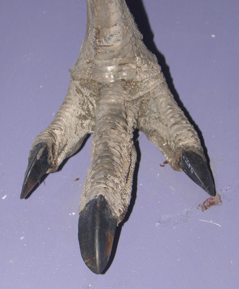 ratites - flightless birds without a keel on its sternum for attachment of wing muscles. They do have vestigial wings which are about 20 cm long. Although useless for flight, they are flapped while running, perhaps for stabilization. They can attain speeds of almost 50 km when running. A normal walking stride is about 1 meter, but a running stride can approach 3 meters. The feet have 3 toes, all facing forward. The middle toe is by far the largest and can be utilized as a weapon when the emu kicks.
