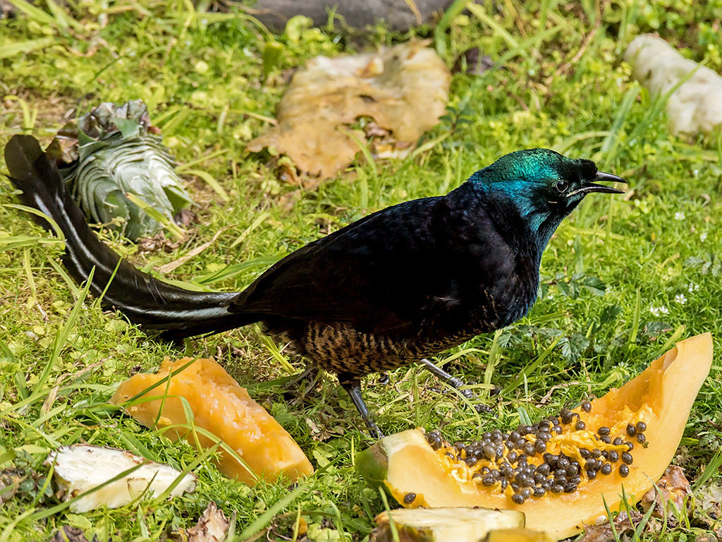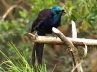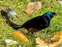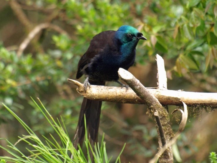 The males have highly iridescent plumage and remarkably long tails. Females are duller and have shorter tails.