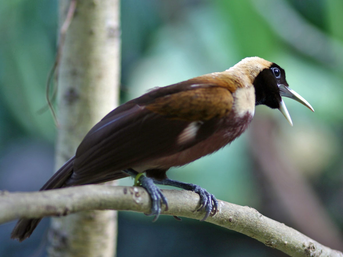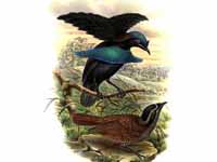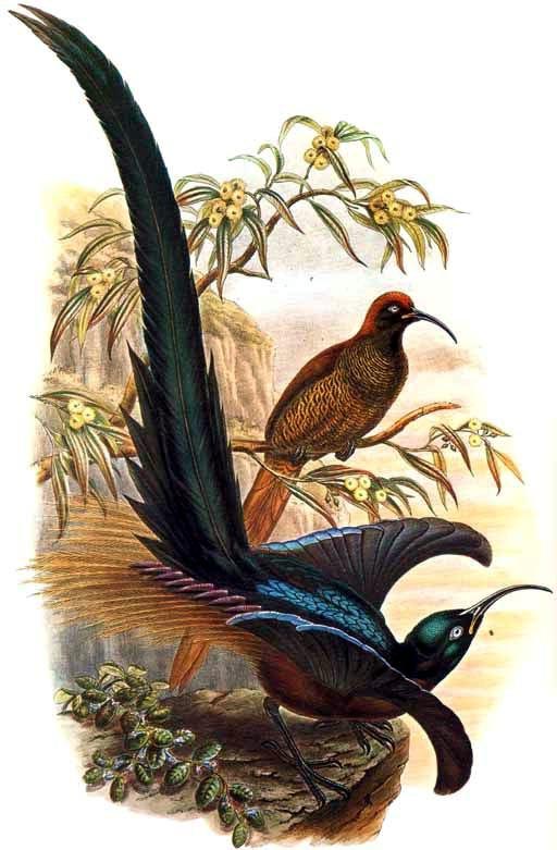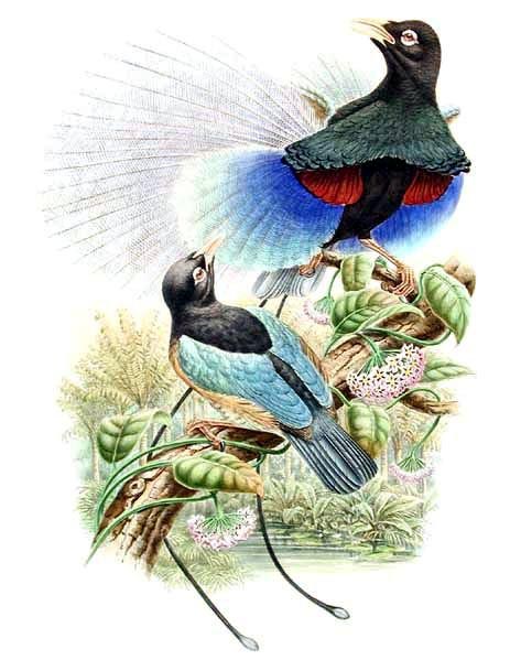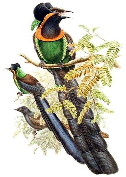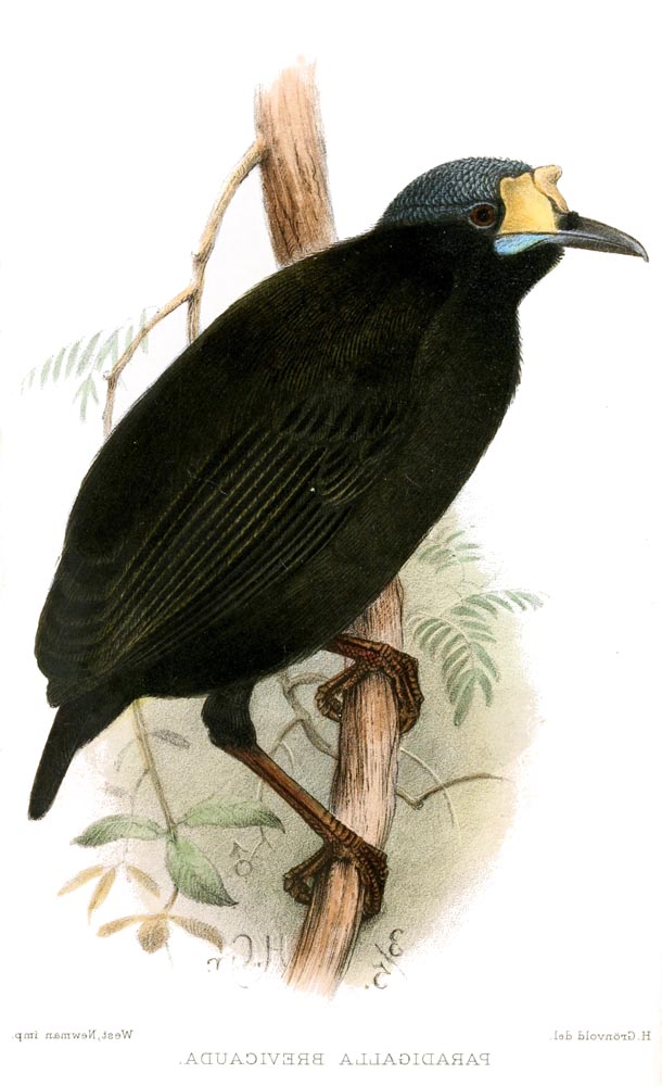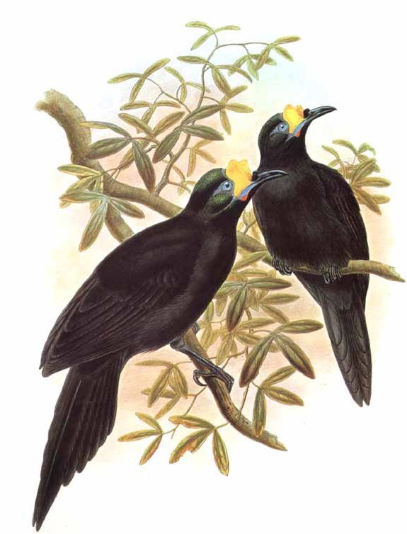 These birds of paradise are commonly known as riflebirds, so named for the likeness of their black velvety plumage to the uniform of the Rifle Brigade