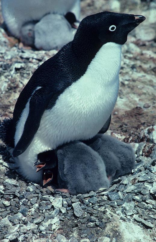 Most penguins are colonial nesters, some sites having well over a 100,000 nests! When there is prey such as leopard seals in the vicinity it to the group's benefit for an unlucky penguin fall into the water and graphically demonstrate if these seals are close by. While nesting, some penguin parents take daily shifts with the eggs or chicks, one staying near by while the other goes for food. Other species are away for a week or even months at a time. The length of separation depends on how accessible the nest is to the ocean. The longer it takes to get to the food suppy, the longer the separation has to be.