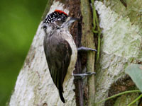 Their upperparts are dark green, brownish, or greyish. Their crown is black and usually has white dots. The typical male has red or yellow dots / stripes on the forecrown. Their bills are a combination of black and grey with the upper-mandible being more black and the lower-mandible more grey - especially at the base. The tongue is long so it can be inserted in excated holes to capture the prey. They eat small insects, favoring ants, termites, beetles and their larvae. Foraging is done in trees, a combination of gleaning and also typical woodpecker hammering with their wedge-shapaed bills. The nest is excavated in a dead tree or dead limb.