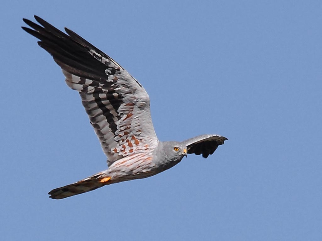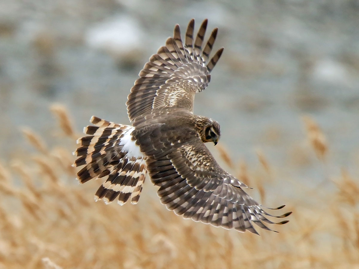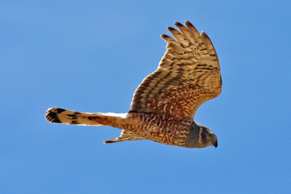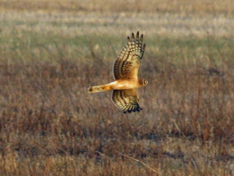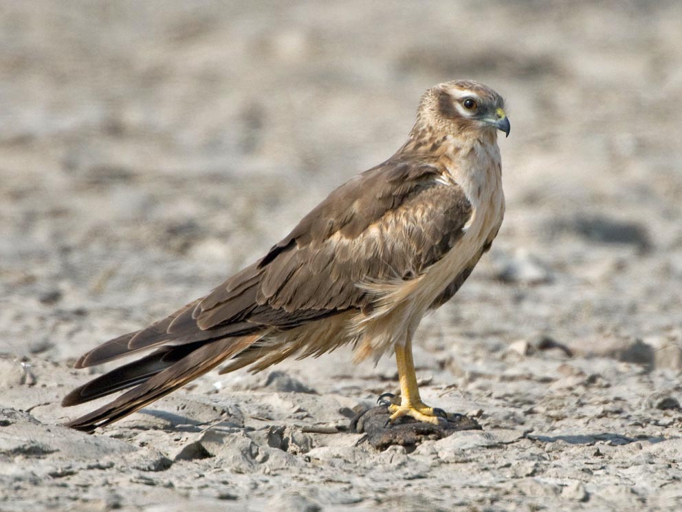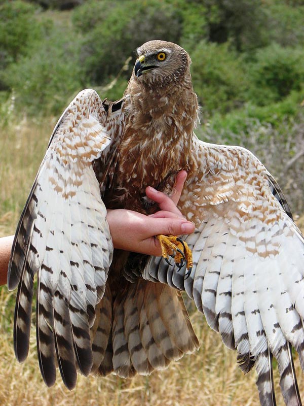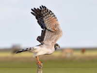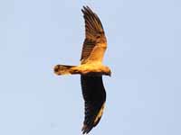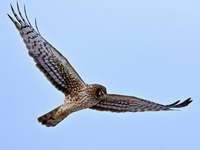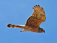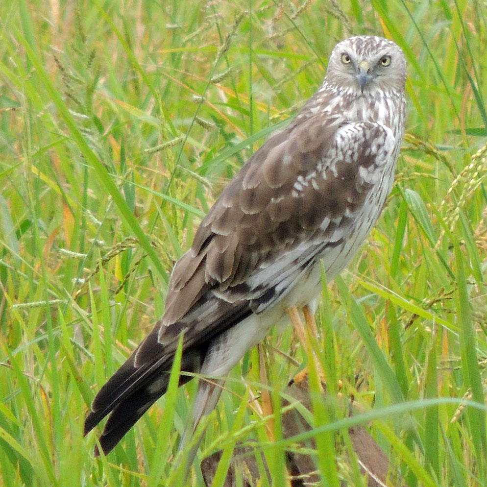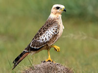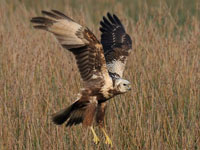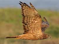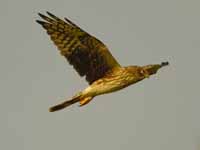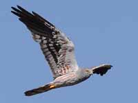 harriers. The mostly hunt by flying low over open ground such as grassland or marshes, feeding on small mammals, reptiles, or birds. These harriers have a slim body, narrow wings and a long tail. Harriers nest on the ground. Males and females have distinct plumage.
