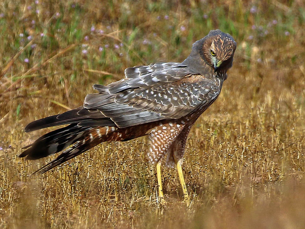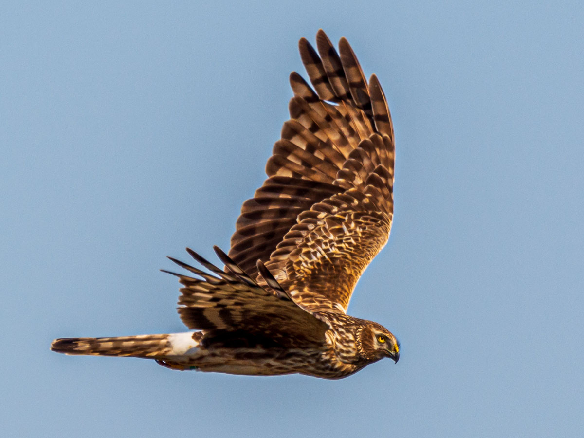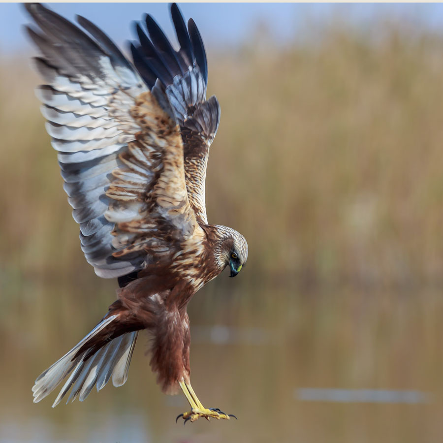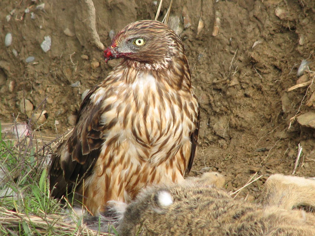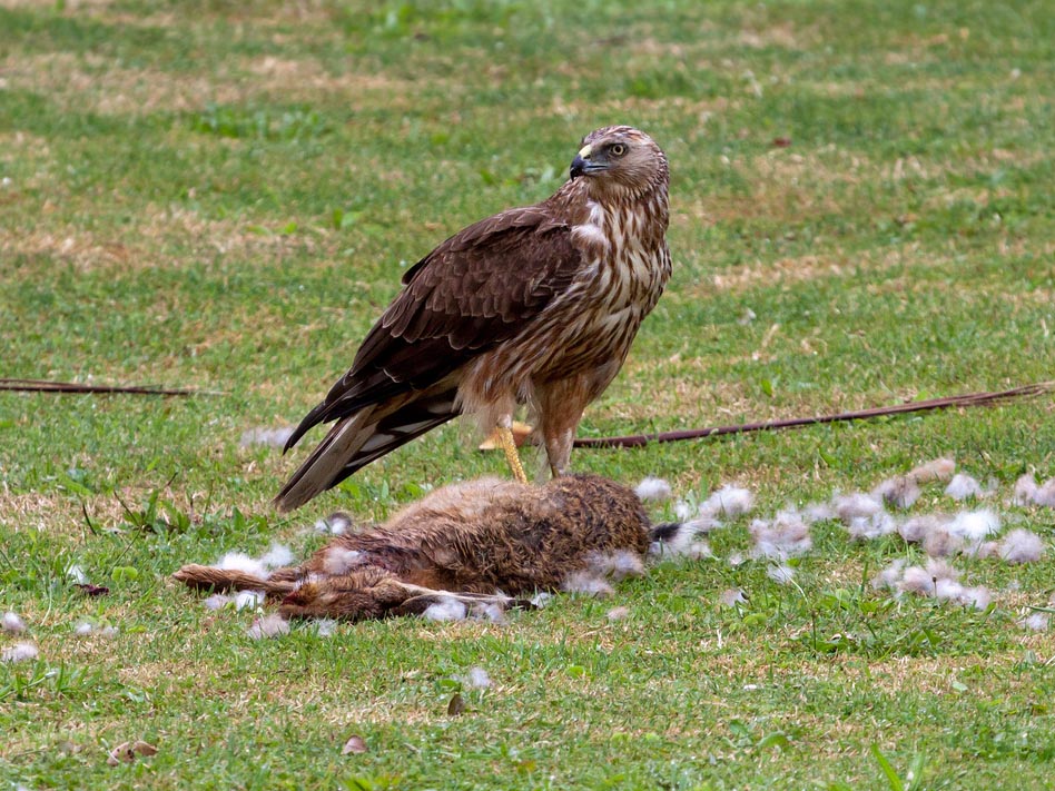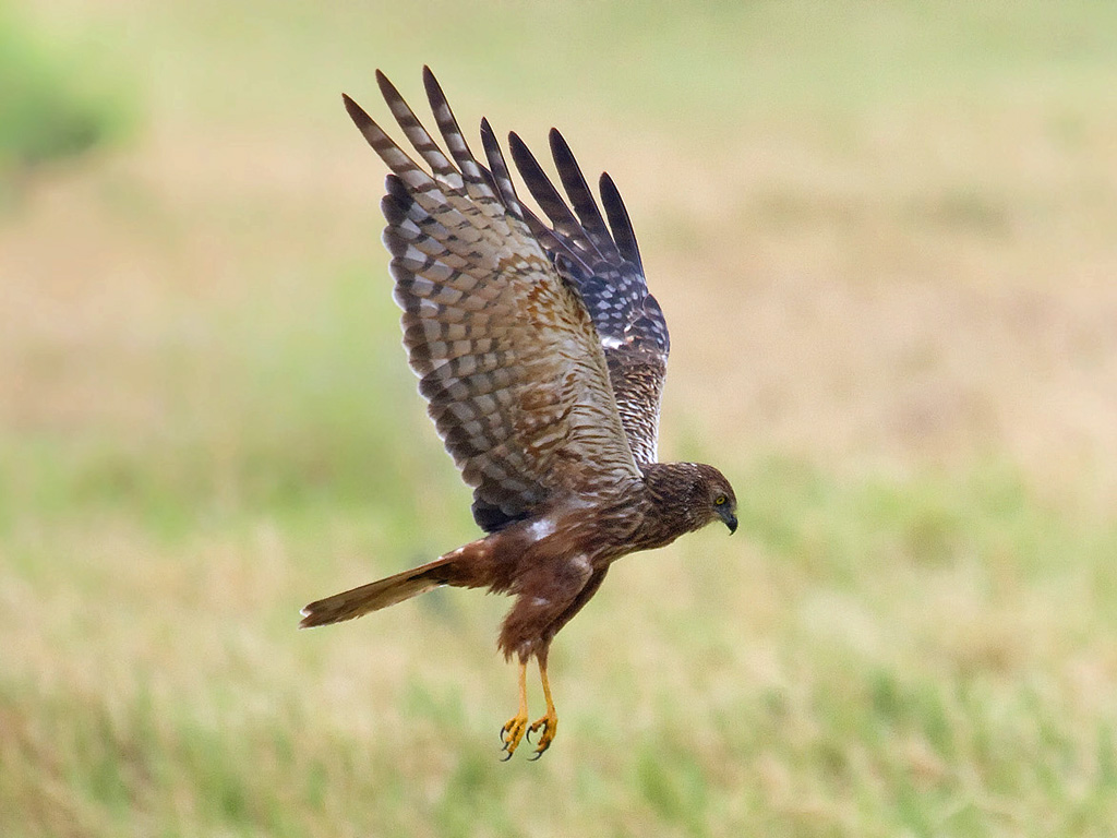 harriers. The mostly hunt by flying low over open ground such as grassland or marshes, feeding on small mammals, reptiles, or birds. These harriers have a slim body, narrow wings and a long tail. Harriers nest on the ground. Males and females have distinct plumage.