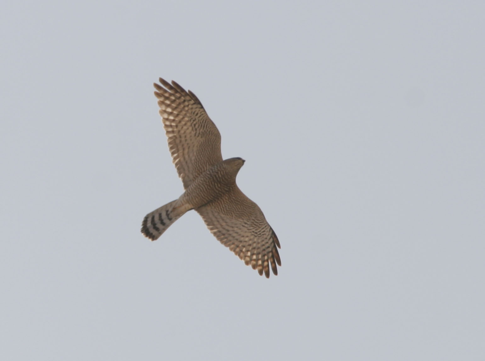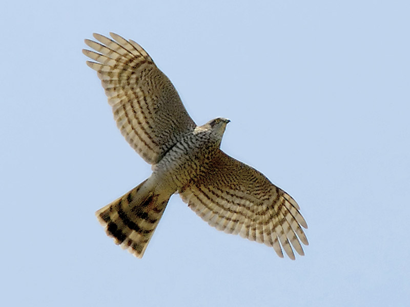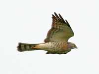 sparrowhawks. These birds are slender with short broad rounded wings and a long tail which helps them maneuver in flight. They have long legs and long sharp talons used to kill their prey, and a sharp hooked bill used in feeding. Females tend to be larger than males. They often ambush their prey, mainly small birds and mammals, capturing it after a short agile chase. The typical flight pattern is a series flaps (often 2) followed by a short glide. These hawks usually stalk their prey by sitting in a tree which implies that are not usually found in areas without any trees. On the other hand, the wooded area should not be do dense that they can not see their prey or manoouver to chase them. The Eurasian sparrowhawk is smallest of the genus with the male weighing under 85 grams andthe female under 105 g. The northern goshawk can be more than 10 times heavier with male up to 1100 grams and the female up to 1400 g.