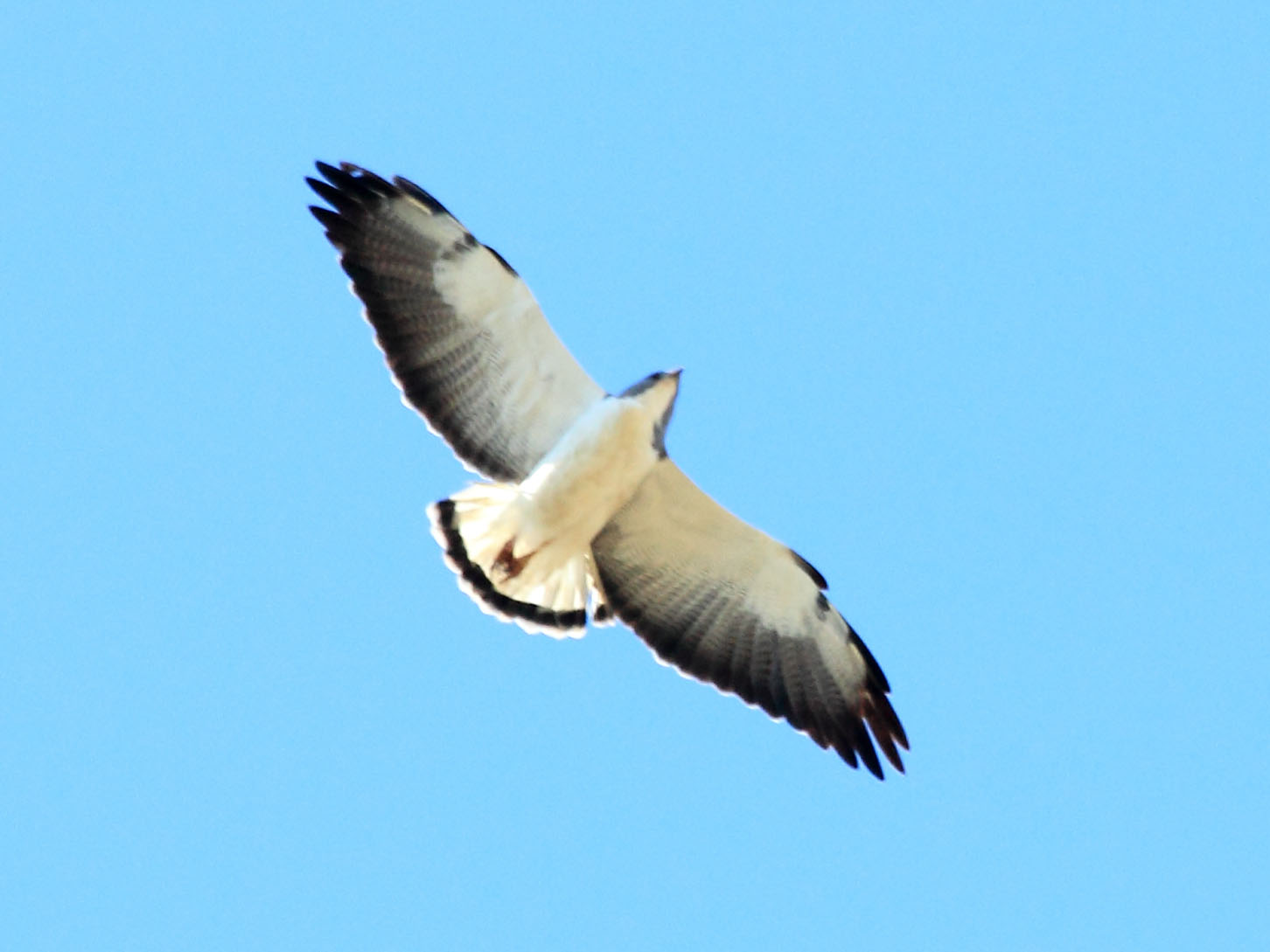 These are small kites. They have pale tails with dark bars, a white throat with a dark stripe down the middle, and a blunt bill with two notches on each side of the upper mandible.