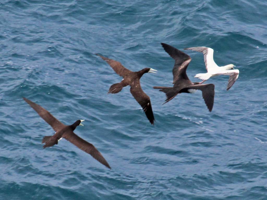 1) Juvenile 5) From left to right: two Brown Boobies and a Great Frigatebird pursuing a Red-footed Booby that probably has a fish.