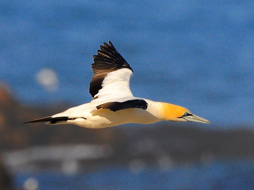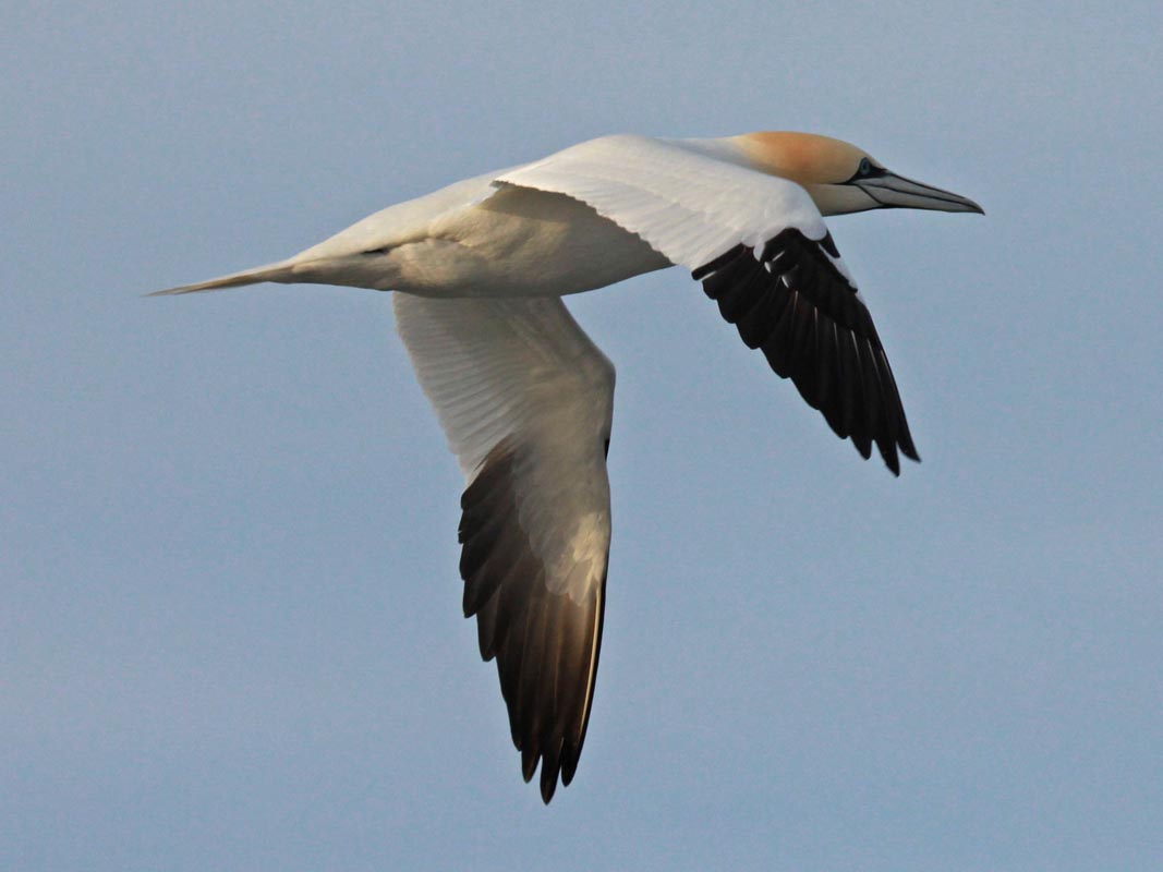 Gannets belong to the genu Morus. Morus comes from a Greek word meaning "foolish" and it was applied to gannets as when they are breeding they show little fear of humans and are easily killed. The three gannet species all have a yellowish head, black-tipped wings, a long bill, and large wingspans. They are fish eaters and plunge dive to capture their prey. Their wedge-shaped bill aids them to able to dive from 30 meters and thus enter the water at high speeds. Before entering the water, the wings are extended back and held close to the body so that there is less resistance from the water. Otherwise a 100 km/hr entry would break the wings.
