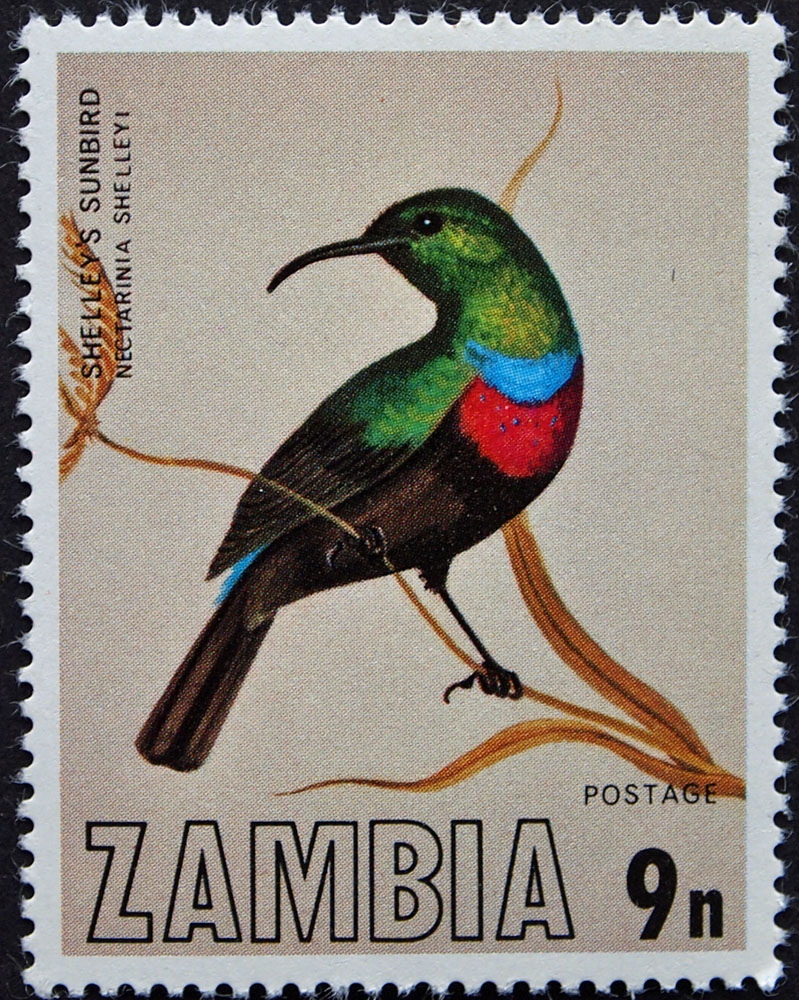 Sunbird,_Shelley's Cinnyris shelleyi Found: DR Congo, Malawi, Mozambique, Tanzania, Zambia, Zimbabwe
