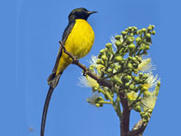 Most sunbirds feed largely on nectar, although they will also take insects, especially when feeding young. Fruit is also part of the diet of some species.