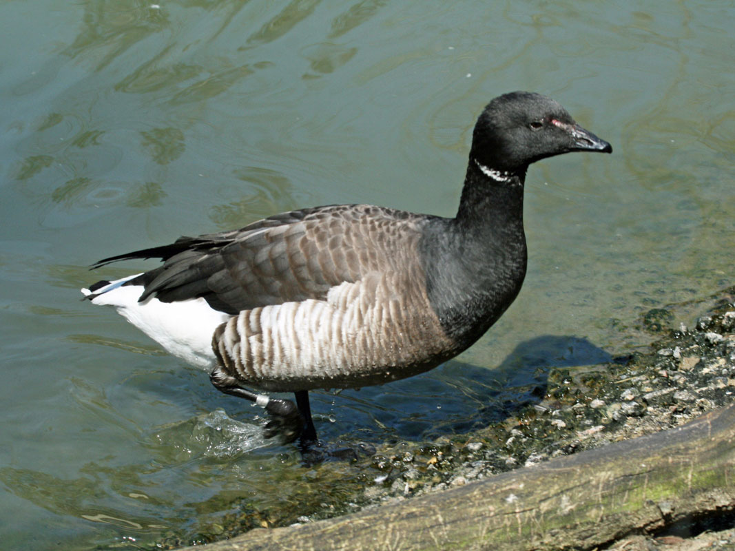 The Branta geese can be distinguished from other geese by their legs and feet, which are black or very dark grey. Furthermore, they have black bills and large areas of black on the head and neck.