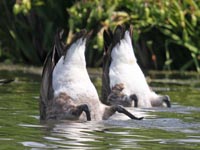 Most geese species are mainly vegetarians. Many will dabble for aquatic food, but even the species that graze mainly on the land prefer to live close to water for protection as all geese are excellent swimmers. Taken as a whole, gease will eat aquatic vegetation, algae, grasses, sedges and kelp. Some specices will eat insects, small fish, and crustaceans. In the winter time when greens are harder to find most geese will the dregs of crop fields such as corn and other grains, rice, beans, and even potatioes.