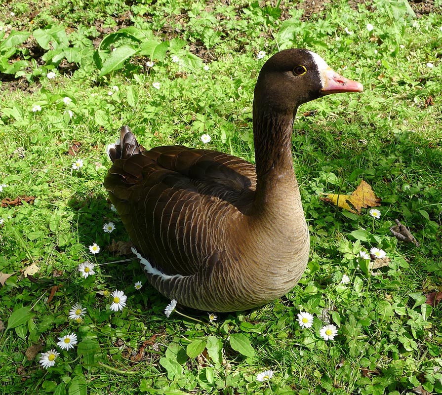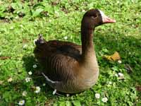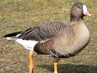 Branta geese have black or dark-grey legs and feet. Also the typical Branta goose has more black on its head and neck than does the typical Anser goose. The "white geese" are a small group of waterfowl which used to be placed in genus