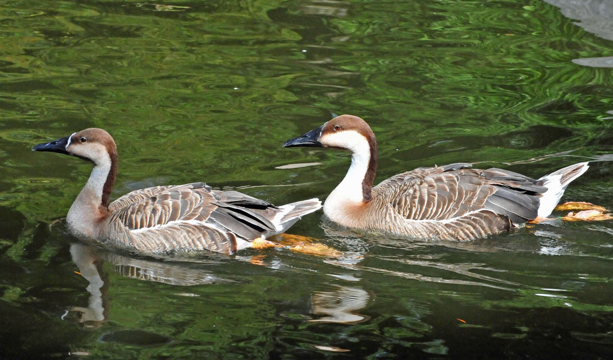Most species of the order Anseriformes spend a considerable amount of time in water. In fact, they are called waterfowls. Their webbed feet make for efficient swimming. A few species spend little time in water and thus their feet are only partially webbed. Most waterfowl are also good flyers, many migrating long distances to escape the cold and others migrating shorter distances for optimizing their food supply. All species, except the screamers, have a wide and relatively flat bill. The shape of a species bill and also their tongue is a function of their diet. Considering the entire order, they eat aquatic plants, grasses, sedges, algae, plankton, insects, insect larvae, mollusks, crustaceans, fish, fruits, grains, rice. Most species are monogamous and if they lose a partner seem to mourn. Males are larger and heavier than females. The chicks are well developed when they hatch and can walk almost immediately.