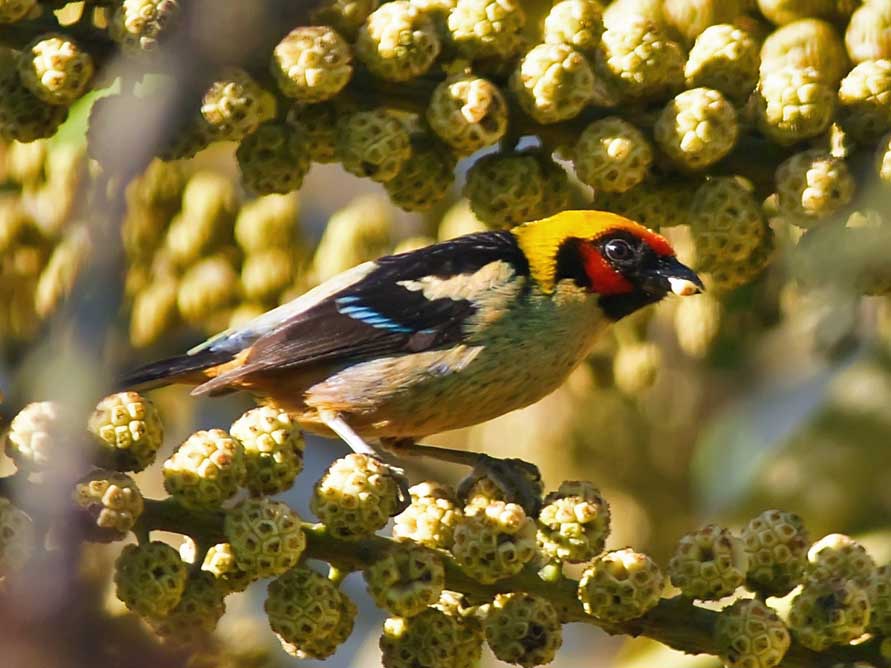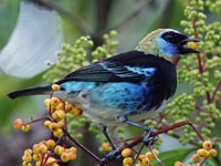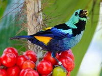 Most tangara tanagers are spectacularlu colored. They pick insects from leaves, or sometimes in flight, but fruit is a major dietary item, accounting for 53-86% of food items in those species which have been studied.