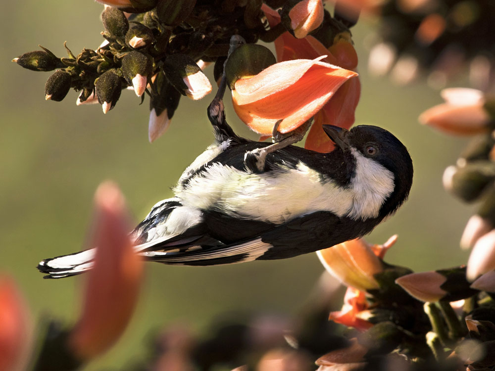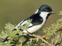 These tits are from Africa and most have black and white plumage. They range from 12 to 18 cm long. The diet is similar to the other tit family members: insects, larvae, spiders plus fruits and seeds for some of the genus.
