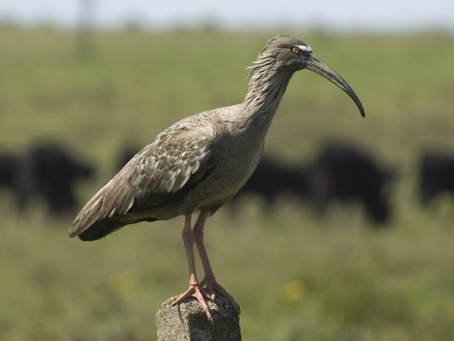 Found in open, grassy habitats in South America. All have a long, decurved dark bill, relatively short reddish legs that do no extend beyond the tail in flight, at least the back is gray.