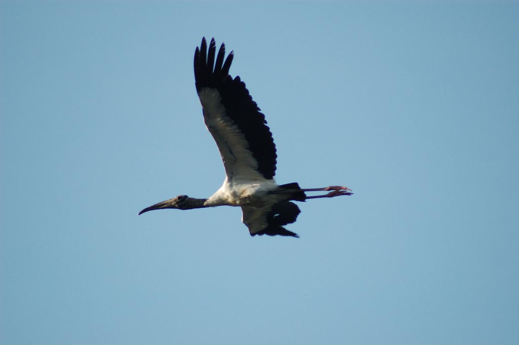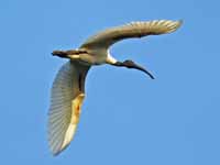 Members of the Threskiornithida family have long necks and legs. The bill is also long, curved downward in the case of the ibises, straight and flattened in the spoonbills. They fly with their necks and legs extended. They are strong fliers and can conserve energy by soaring. They lack a true voice-producing mechanism and is silent except for occassional grunt like sounds. They are found throughout much of the world, often by water but also in dry areas.